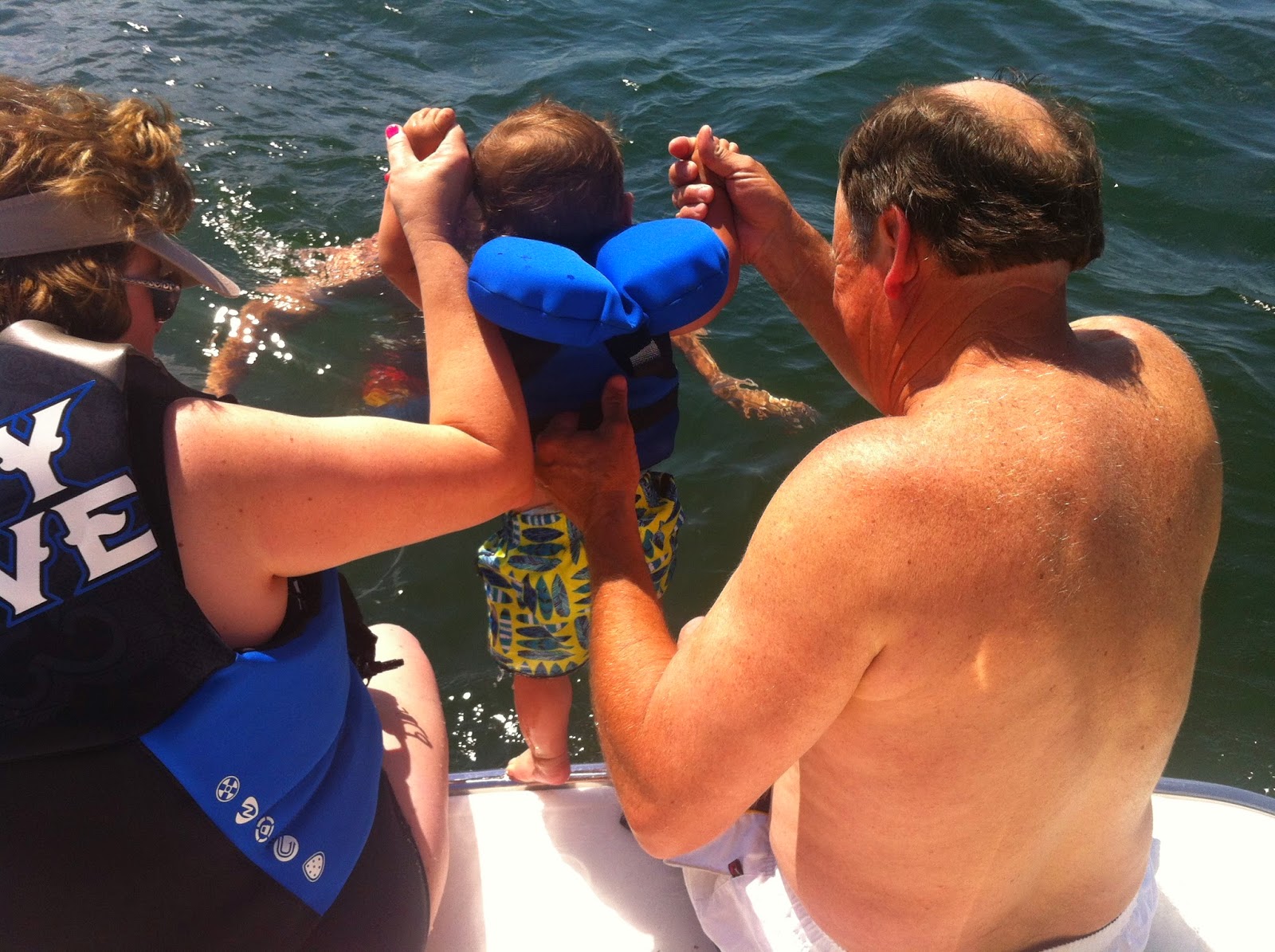 Day 296: First swim at the lake! The water was wayyy too cold for Mommy but Cooper didn't seem to mind one bit! He and Pops started by just splashing their feet and then he decided to hop right on in. We have an official lake baby!